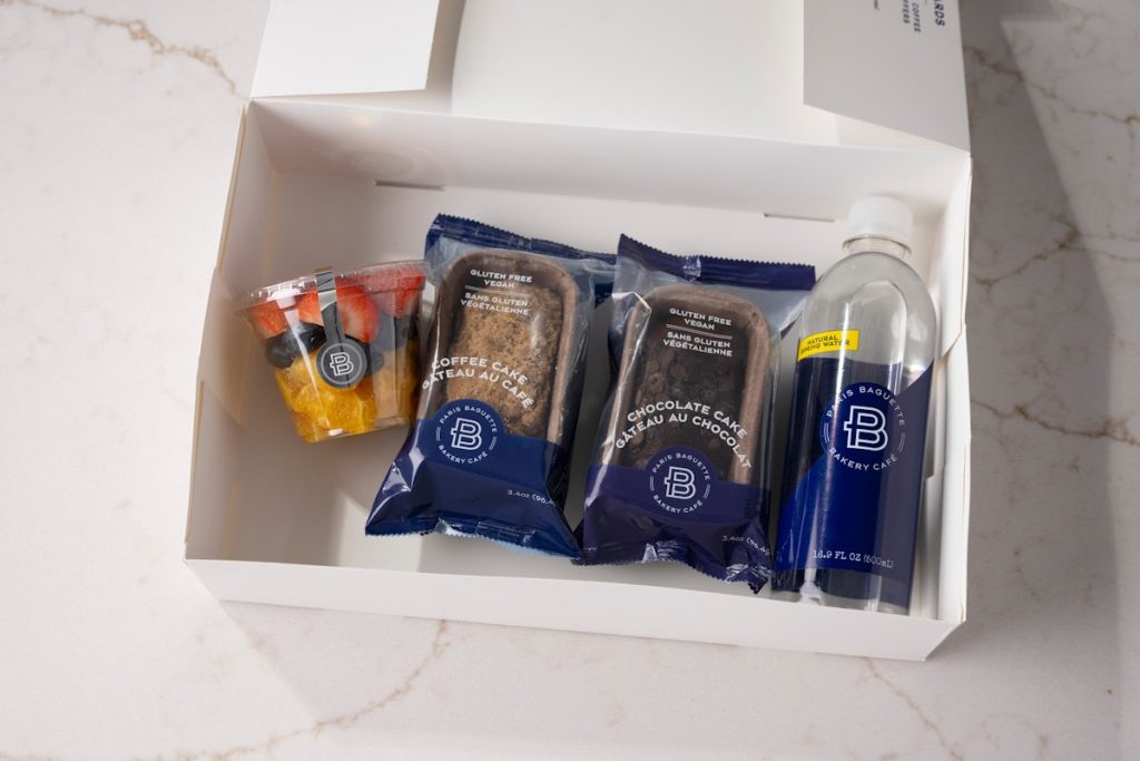Each individual box includes a gluten-free vegan coffee mini loaf, gluten-free vegan double chocolate chip mini loaf, fruit cup (strawberries, blueberries, orange segments), and a choice of bottled water or juice.